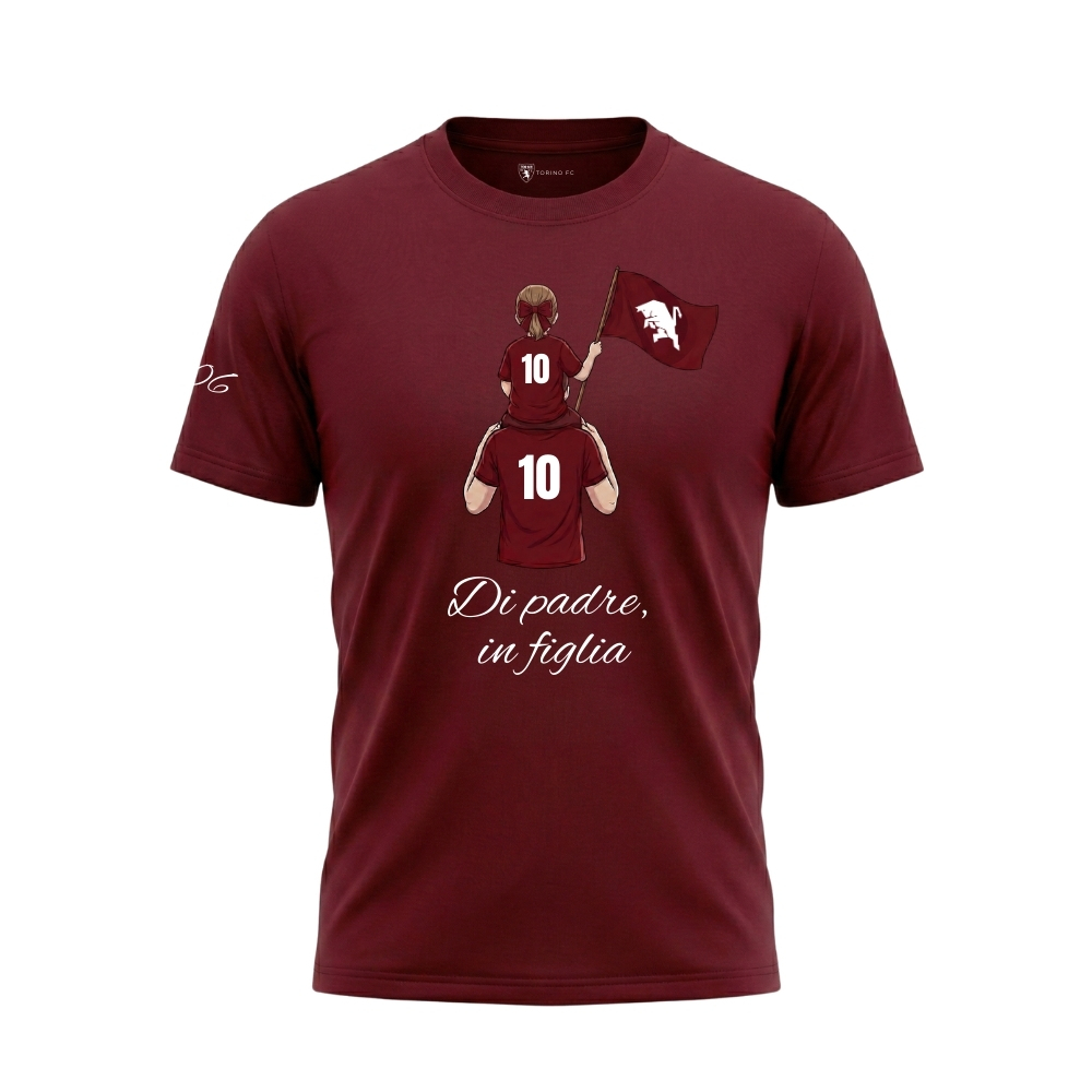 Celebrate the bond that connects generations of Granata fans with the “Father to Daughter” T-shirt. Made from cotton, this T-shirt features a front graphic depicting a young girl on her father’s shoulders waving the Toro flag – a symbolic image of a passion passed down through generations. The design is completed by the number 10 on the characters’ shirts and the 1906 detail printed on the sleeve, paying tribute to the founding year of Torino FC. Perfect to wear at the stadium or in everyday life, it is designed for those who live the Granata passion as a true family tradition.